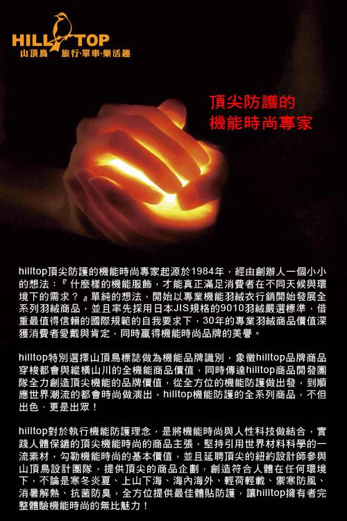 【hilltop山頂鳥】女款半開襟拉鍊口袋保暖刷毛上衣H51FG2藍 此款有兩色可供選擇:藍色/紫色 功能: ZISOFIT保暖、吸溼快乾 外層: ZISOFIT纖維刷毛布 商品簡介: • 適合戶外健行及日常生活的保暖上衣。 • 刷毛材質較保暖透氣不悶熱、柔軟舒適、輕量化。 • 立領半開襟拉鍊設計,加強保暖效果。 • 領圍、袖口LOGO字樣包邊設計,增添活潑性。 • 前胸拉鍊口袋置物設計。 • 前胸LOGO繡花設計。 HILLTOP運用最佳的創意和最新的高科技材質,將流行與機能緊密的結合,設計成為具有個性的產品提供給消費者。 全心享樂,是HILLTOP的願景,期望透過整合式的旅遊休閒商品與服務,讓消費者盡情徜徉在快樂休閒中。