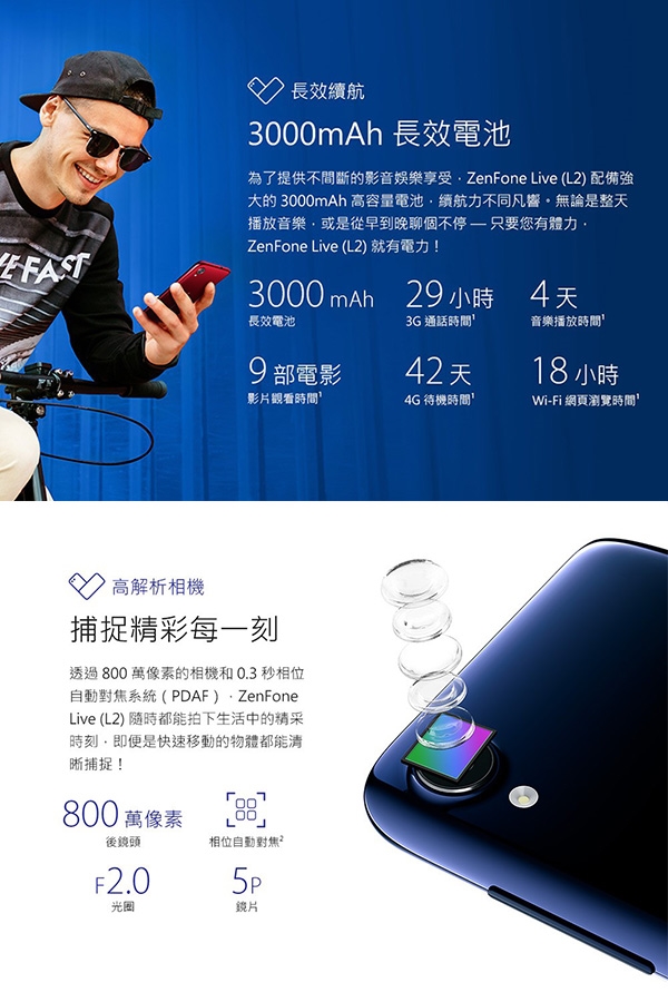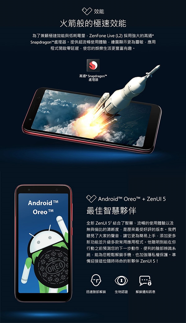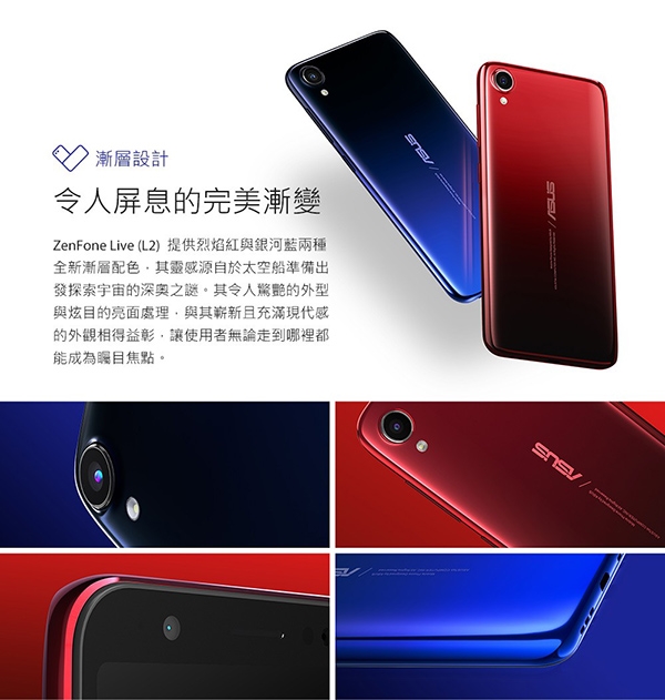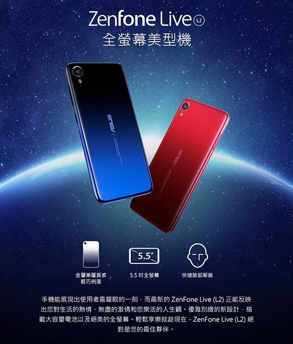 ■5.5吋18:9 HD IPS螢幕、漸變色機身設計 ASUS ZenFone Live (L2) ZA550KL (2G/16GB)採用漸變色機身設計,並擁有5.5吋 HD IPS螢幕,以18:9長寬比搭配窄邊框,提供82.3%螢幕佔比,無論追劇、手遊,能具備更廣闊的視野,讓您有影院般的視覺享受。同時它還搭載多重螢幕功能,讓您一次瀏覽兩個App畫面,讓多工作業更輕鬆便利。 ■獨立三卡插槽、臉部解鎖 ASUS ZenFone Live (L2) ZA550KL (2G/16GB)採用Android 8.0 Oreo作業系統、ZenUI 5操作介面,內建Qualcomm Snapdragon 425四核心處理器、2GB RAM / 16GB ROM,採用獨立三卡插槽,支援4G+3G雙卡雙待;此外,它同時還具備臉部辨識解鎖功能,當天氣冷、雙手潮濕或穿戴手套時,只要注視螢幕即可快速解鎖,操作更便利直覺。 ■隨時捕捉生活精彩 ASUS ZenFone Live (L2) ZA550KL (2G/16GB)搭載800萬畫素主相機,採用5P鏡頭、F2.0光圈,支援PDAF相位對焦,內建汽車、美女、全景、時間流逝等四種模式,讓您能更有創意的控制拍攝效果。同時也配備500萬畫素前鏡頭、F2.4光圈,搭配美顏功能,呈現更清晰亮麗的自拍品質。此外,它還支援VoLTE/VoWifi、Wi-Fi 802.11 b/g/n無線網路、Bluetooth V 4.0,讓您工作娛樂同時兼顧。 ■長效電池 ASUS ZenFone Live (L2) ZA550KL (2G/16GB)為了讓您影音娛樂不停歇,配備了3,000mAh高容量電池,續航力不同凡響,但機身輕巧好握,給您輕鬆無負擔的使用體驗;無論是整天播放音樂,或是從早到晚聊個不停--只要您有體力,它就有電力!它可提供約長達29小時3G通話時間、長達約4天音樂播放、多達約9部電影長度的可觀看時間、長達約42天4G待機時間以及長達約18小時WiFi網頁瀏覽! ★產品包裝說明:原廠手機*1【+內建電池(3,000mAh)】+原廠USB充電器*1+原廠充電線*1+原廠耳機*1+頂針*1+使用說明書*1(實際標準配備以原廠到貨為準,如有錯誤或不符者,將不再另行補寄或更換,謝謝!) 商品規格 品牌 : ASUS華碩 種類 : 智慧手機 型號 : ZenFone Live L2 ZA550KL (2G/16G) 顏色 : 紅色系, 藍色系 螢幕尺寸 : 5.5吋 處理器類型 : 四核心 處理器型號 : Qualcomm Snapdragon 425四核心處理器 處理器時脈 : Qualcomm Snapdragon 425四核心處理器 主相機畫素 : 800萬 前置鏡頭畫素 : 500萬以下 螢幕解析度 : 1,440 x 720 pixels 螢幕技術 : IPS RAM記憶體 : 2GB ROM/內建儲存空間 : 16GB 記憶卡插槽 : microSD 作業系統 : Android 8.0 Oreo作業系統、ZenUI 5操作介面 機身長度 : 147.26 mm 機身寬度 : 71.77 mm 機身厚度 : 8.15 mm 機身重量 : 約140g(含標準電池) 電池容量(mAh) : 3,000mAh 待機時間(最大) : 依原廠公告 通話時間(最大) : 依原廠公告 特色 : 臉部辨識, 支援4G LTE 傳輸介面 : Bluetooth藍牙, USB 頻率系統 : 4G LTE(支援台灣4G全頻段飆網) 上網方式 : 4G, WiFi 4G LTE頻段 : 4G LTE(支援台灣4G全頻段飆網) 雙卡頻段 : 4G+3G SIM卡 : nano sim NCC認證碼 : CCAF184G0210T8 標準配備 : 原廠手機*1【+內建電池(3,000mAh)】+原廠USB充電器*1+原廠充電線*1+原廠耳機*1+頂針*1+使用說明書*1(實際標準配備以原廠到貨為準,如有錯誤或不符者,將不再另行補寄或更換,謝謝!) 保固 : 1年 注意事項 : 以上資料與圖片僅供參考!規格及隨機標準配備以實際出貨為主,如有錯誤或不符者,將不再另行補寄或更換,謝謝! 體驗說明 使用方法說明 ★產品包裝說明:原廠手機*1【+內建電池(3,000mAh)】+原廠USB充電器*1+原廠充電線*1+原廠耳機*1+頂針*1+使用說明書*1(實際標準配備以原廠到貨為準,如有錯誤或不符者,將不再另行補寄或更換,謝謝!) 注意事項 ★保固:原廠或代理商保固一年(手機保固一年,配件保固3個月) ★保固範圍:新品故障或瑕疵時可申請換貨處理 ■退貨:退貨商品必須是全新狀態且包裝完整,商品及相關配件、贈品不得缺件、刮傷或有智慧財產權之配件無使用,否則恕不接受退貨。退換貨時,請另外使用其他紙箱或袋子包覆於商品原廠包裝之外,切勿直接於原廠包裝上黏貼紙張或書寫文字。若原廠包裝損毀將無法辦理退貨事宜,敬請見諒!(請注意:商品於審閱期內請勿註冊、包膜、刷機,以免影響退換貨權利;另商品一經刷機,保固將失效!) 華碩客服專線:0800093456 十天鑑賞期說明 依照消費者保護法規定,線上購物消費者均享有商品到貨10天鑑賞期之權益。 但退換貨商品必須為全新狀態且有完整的包裝。如需於鑑賞期內退換貨,請保持商品之完整性,如有人為疏失皆需收取部份費用(含紙盒、手機主體與配件等)。 手機商品如需辦理退換貨事宜,請先勿安裝SIM卡或撥號通話,但商品因本身瑕疵申請換貨者,不在此限!此外,鑑賞期並非試用期,切勿破壞產品外包裝(含相關贈品);也請勿塗鴉寫字於其上。最後叮嚀:軟體屬智財權之ㄧ部分,若不確定是否需要者,請勿先行註冊,以免損及退換貨權利。 完整包裝定義 ●包裝不得有刮傷(含主商品、附件或其他贈品):驅動程式、應用軟體(不可拆封)、作業系統軟體(不可拆封)、電源線、變壓器、電話線●包裝包含外紙箱、內紙箱、配件紙箱、保麗龍、保護袋、贈品等廠商及所有附隨文件或資料之完整性,一經拆封即無法回復商品原狀。若需辦理退換,請先勿拆封並保持商品送達時之原狀。 法規小提醒 依電信法49條第3項規定,電信管制射頻器材非經型式認證、審驗合格,不得製造、輸入、販賣或公開陳列;另電信法50條第2項授權訂定之電信管制射頻器材審驗辦法第15條第1項規定,審驗合格標籤及符合性聲明標籤專屬取得型式認證證明者及完成符合性聲明登錄者所有。消費者可利用下列網址