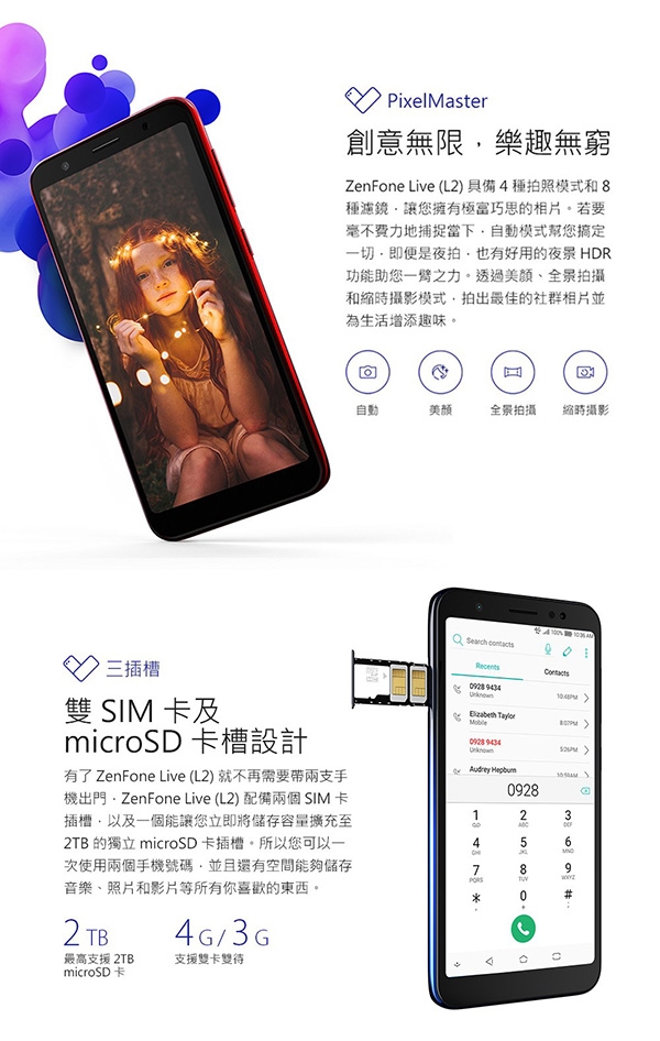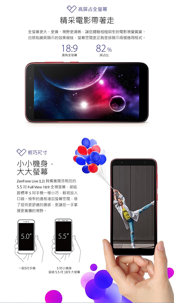 5 5吋18 9全螢幕 金屬漸層質感輕巧俐落 800萬畫素主相機 500萬畫素前鏡頭 臉部解鎖 獨立三卡插槽 支援VoLTE VoWifi 品牌 ASUS華碩種類 智慧手機型號 ZenFone 售價:3688